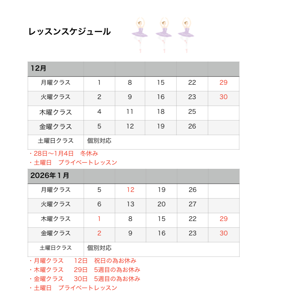 レッスンスケジュール12月・1月